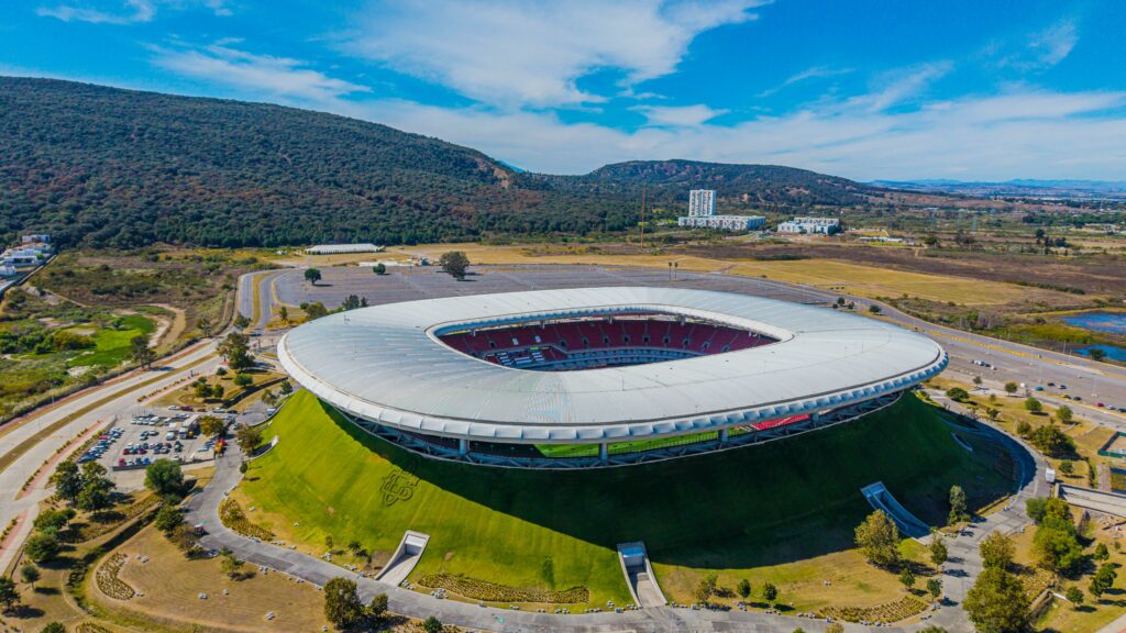 Plus petit des stades mexicains de cette Coupe du Monde, l’Estadio Akron est situé à Guadalajara. Inauguré en 2010, il est l’un des stades les plus incongrus de cette Coupe du Monde 2026, construit sur une sorte de colline qui le fait particulièrement ressortir aux environs.