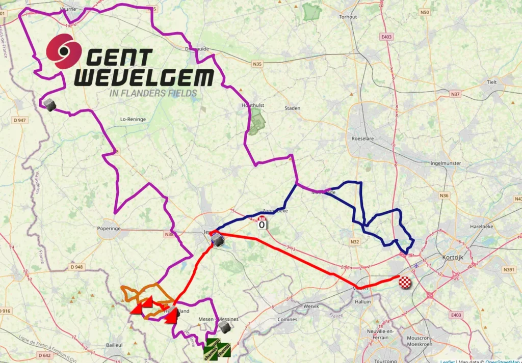 Les femmes prennent le départ à Wevelgem. Via Gullegem et Moorsele, elles rejoignent le départ officiel. Elles passent ensuite par Zonnebeke, Langemark-Poelkapelle et Ypres avant d’atteindre les monts du Heuvelland.