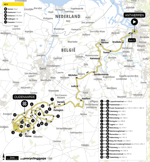 L’enchaînement avec le Taaienberg renforce encore la difficulté du parcours. Après cette ascension, les coureurs franchissent à nouveau le Hotond, avant de se diriger vers la dernière montée de l’Oude Kwaremont, située une dizaine de kilomètres plus loin. Ce dernier passage intervient à 16,7 kilomètres de l’arrivée. Il est probable que les principaux prétendants à la victoire soient déjà en tête et s’y livrent une nouvelle bataille. Mais rien n’est encore joué, car le Paterberg se présente une ultime fois à 13,2 kilomètres du but. Court mais très raide, ce mont favorise les coureurs explosifs. Après son sommet, il reste encore treize kilomètres relativement plats jusqu’à Audenarde. Une échappée solitaire sur cette distance reste difficile à maintenir, notamment en raison du vent souvent présent. Si un groupe se présente en tête, la stratégie et la collaboration seront alors déterminantes pour la victoire.
